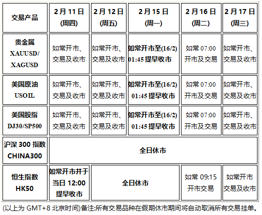 因应美国总统日&中国春节假期影响,以下部分产品的交易时间将于提早或全日休市,敬请阁下知悉留意!